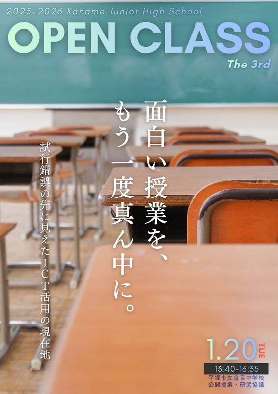 ICTを活用した公開授業を実施しました金目中学校は、2023年度に文科省リーディングDXスクール「生成AIパイロット校」に指定され、先進的な教育研究を行いました。 今年度は、原点に立ち戻り、生徒の学習意欲を引き出す「面白い」魅力的な授業づくりをテーマにしました。 生成AIに加え、Canv等のデザインツールやQubena等のAI型教材を活用し、「個別最適な学び」と「協働的な学び」の充実を図ることで、生徒一人ひとりの学びに向かう力を育成する魅力的な授業づくりを研究し、1月20日に公開授業を行いました。 当日のパンフレットを添付しますので、よろしければご覧ください。 |