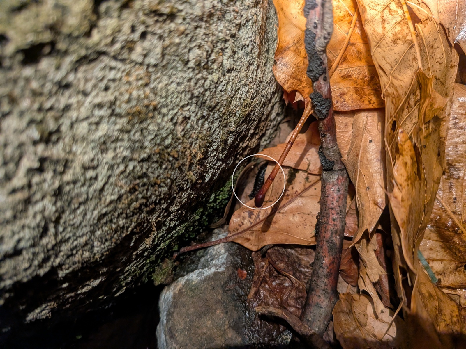 ホタル幼虫の上陸が確認されました! 3月9日、金目地区では19時頃から路面が僅かに濡れる程度の短時間の降雨がありました。そこで、22時過ぎに金目親水公園ホタル水路へ出かけ、先月の11日(放流数350匹)、13日(みずほ小4年生150匹)に放流したゲンジボタルの上陸調査に出かけました。その結果、3匹の幼虫が水路から出て岩を登っていく上陸幼虫が確認されました。降雨量が少なかったため、水路淵の落ち葉や石の上は濡れていましたが、石の側面やオーバーハングした部分は濡れていなかったものの、それでも写真右に見られるように這い上がっていく姿が見られました。 尚、現地22時の気象状況は曇、湿度73%、気温7.0℃、水温17.0℃、地温3.0℃、降雨量0.5mmでした。 (ふぁいあ ふらい) | |