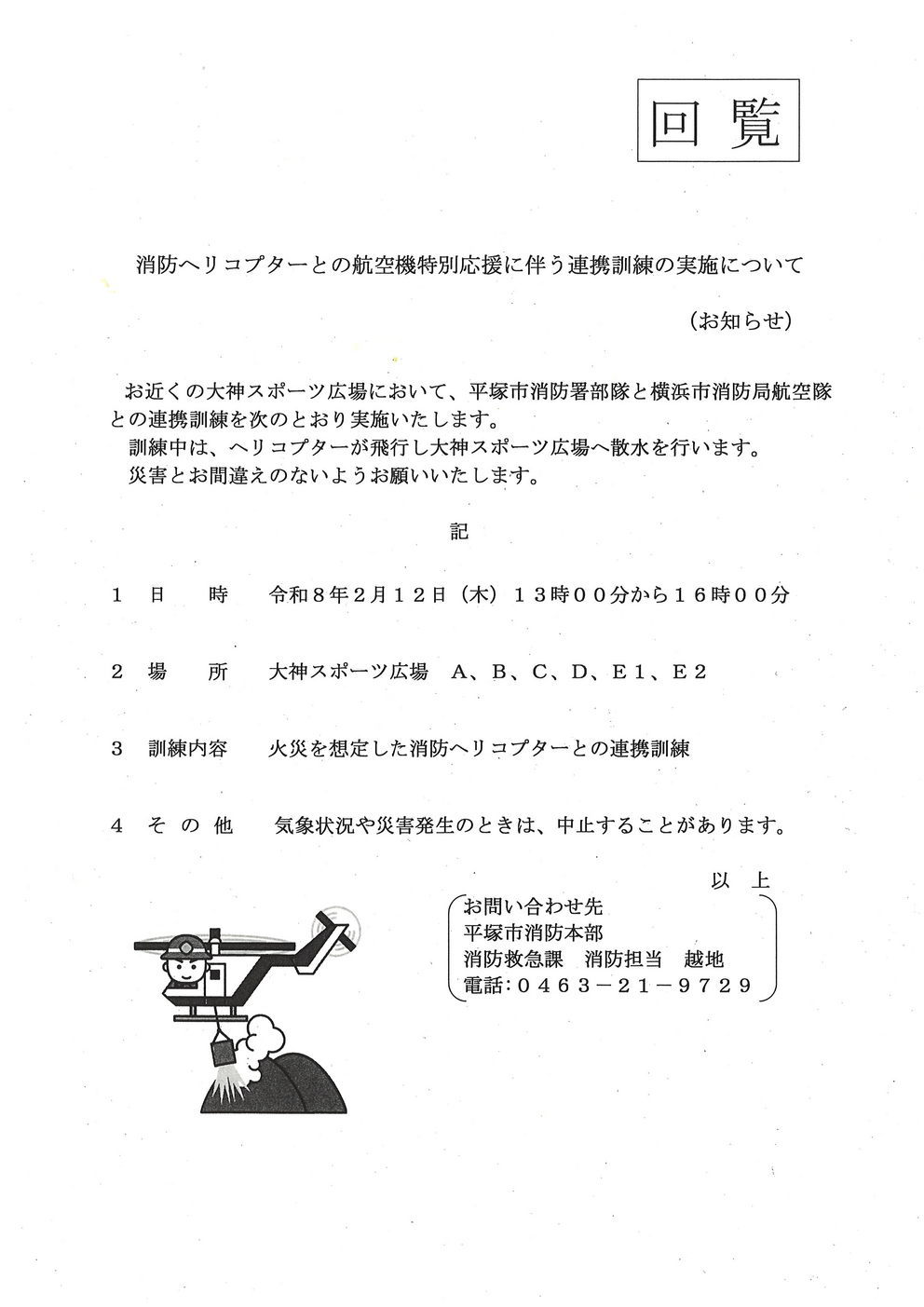 日 時 令和8年2月12日(木) 13時00分から16時00分 場 所 大神スポーツ広場 A,B,C,D,E1,E2 訓練内容 火災を想定した消防ヘリコプターとの連携訓練 そ の 他 気象状況や災害発生のときは、中止することがあります |